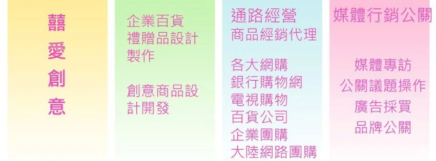 我們的服務: 禮贈品製作/ 經銷代理 / 通路開發 / 媒體公關 / 廣告 / 商品創意設計 / 展覽規畫